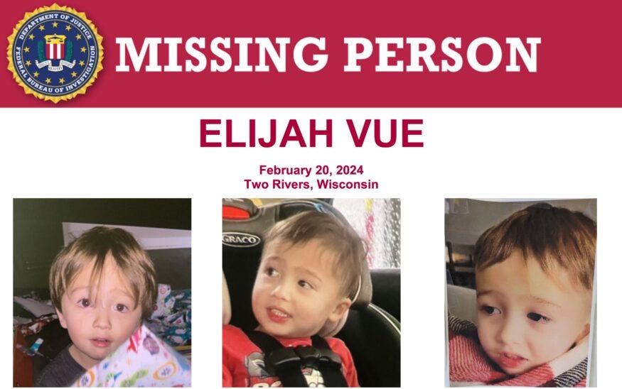 The search for 3-year-old Elijah Vue out of Two Rivers, Wisconsin continues.